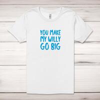 You Make My Willy Go Big Adult T-ShirtA rude unisex adult t-shirt with 'You Make My Willy Go Big' printed across the front of a 100% cotton* t-shirt. This rude t-shirt is great as a gift for any occasion.All of our unisex adult t-shirts are designed and hand-printed in the UK and are manufactured from 100% ringspun cotton for a premium quality feel and feature double-stitched waist hem and sleeves, seamless double-needle collar, taped neck and shoulders, and a tubular body that has been quarter turned to avoid a centre crease; available in sizes from Extra Small to 4XL*. *Black & White tees available in sizes XS - 4XL, all other colours available XS - 2XL Size GuideUnisex adult t-shirts are measured across the chest, in inchesXS 30/32'S 34/36'M 38/40'L 42/44'XL 46/48'2XL 50/52'3XL 54/56'4XL 58/60'See more on our clothing size guide (opens in new tab)Please NoteAll of our items are hand-printed to order, as a result, colours may vary between prints - images are for illustration purposes only.Show more products with the You Make My design