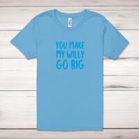 You Make My Willy Go Big Adult T-ShirtA rude unisex adult t-shirt with 'You Make My Willy Go Big' printed across the front of a 100% cotton* t-shirt. This rude t-shirt is great as a gift for any occasion.All of our unisex adult t-shirts are designed and hand-printed in the UK and are manufactured from 100% ringspun cotton for a premium quality feel and feature double-stitched waist hem and sleeves, seamless double-needle collar, taped neck and shoulders, and a tubular body that has been quarter turned to avoid a centre crease; available in sizes from Extra Small to 4XL*. *Black & White tees available in sizes XS - 4XL, all other colours available XS - 2XL Size GuideUnisex adult t-shirts are measured across the chest, in inchesXS 30/32'S 34/36'M 38/40'L 42/44'XL 46/48'2XL 50/52'3XL 54/56'4XL 58/60'See more on our clothing size guide (opens in new tab)Please NoteAll of our items are hand-printed to order, as a result, colours may vary between prints - images are for illustration purposes only.Show more products with the You Make My design