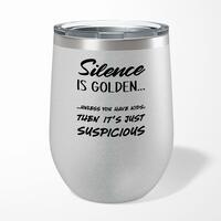 Silence Is Golden Wine TumblerOur Silence Is Golden 12oz tumbler is hand-printed with 'Silence Is Golden' on both sides (front/back) of an insulated stainless steel wine tumbler and available in a variety of colours.Ideal for weekends away or relaxing in the garden, our 12oz Wine Tumbler promises to keep cold drinks cold and hot drinks hot for longer than standard drinkware. Made from premium grade, food-safe stainless steel with double-wall vacuum insulation. A fantastic novelty tumbler, ideal for keeping your favourite tipple at the perfect temperature whatever the weather. High-grade stainless steel double-wall construction. Insulated for hot or cold liquids. Flat bottom design means less risk of accidental spillages. See through lid allows you to carry your beverage around without spilling. Drinking spout incorporated in to the lid. Please Note All of our items are hand-printed to order, as a result, colours may vary between prints - images are for illustration purposes only.