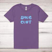 Smug Cunt Adult T-ShirtA rude unisex adult t-shirt with 'Smug Cunt' printed across the front of a 100% cotton* t-shirt. This rude t-shirt is great as a gift for any occasion.All of our unisex adult t-shirts are designed and hand-printed in the UK and are manufactured from 100% ringspun cotton for a premium quality feel and feature double-stitched waist hem and sleeves, seamless double-needle collar, taped neck and shoulders, and a tubular body that has been quarter turned to avoid a centre crease; available in sizes from Extra Small to 4XL*. *Black & White tees available in sizes XS - 4XL, all other colours available XS - 2XL Size GuideUnisex adult t-shirts are measured across the chest, in inchesXS 30/32'S 34/36'M 38/40'L 42/44'XL 46/48'2XL 50/52'3XL 54/56'4XL 58/60'See more on our clothing size guide (opens in new tab)Please NoteAll of our items are hand-printed to order, as a result, colours may vary between prints - images are for illustration purposes only.Show more products with the Smug Cunt design