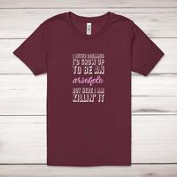 Grow Up To Be An Arsehole Adult T-ShirtA rude unisex adult t-shirt with 'I Never Dreamed I'd Grow Up To Be An Arsehole But Here I Am Killing' It' printed across the front of a 100% cotton* t-shirt. This rude t-shirt is great as a gift for any occasion.All of our unisex adult t-shirts are designed and hand-printed in the UK and are manufactured from 100% ringspun cotton for a premium quality feel and feature double-stitched waist hem and sleeves, seamless double-needle collar, taped neck and shoulders, and a tubular body that has been quarter turned to avoid a centre crease; available in sizes from Extra Small to 4XL*. *Black & White tees available in sizes XS - 4XL, all other colours available XS - 2XL Size GuideUnisex adult t-shirts are measured across the chest, in inchesXS 30/32'S 34/36'M 38/40'L 42/44'XL 46/48'2XL 50/52'3XL 54/56'4XL 58/60'See more on our clothing size guide (opens in new tab)Please NoteAll of our items are hand-printed to order, as a result, colours may vary between prints - images are for illustration purposes only.Show more products with the Grow Up To Be An Arsehole design