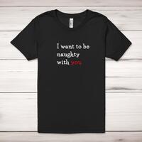 Naughty With You Adult T-ShirtA novelty unisex adult t-shirt with 'I Want To Be Naughty With You' printed across the front of a 100% cotton* t-shirt. This novelty t-shirt is great as a gift for any occasion.All of our unisex adult t-shirts are designed and hand-printed in the UK and are manufactured from 100% ringspun cotton for a premium quality feel and feature double-stitched waist hem and sleeves, seamless double-needle collar, taped neck and shoulders, and a tubular body that has been quarter turned to avoid a centre crease; available in sizes from Extra Small to 4XL*. *Black & White tees available in sizes XS - 4XL, all other colours available XS - 2XL Size GuideUnisex adult t-shirts are measured across the chest, in inchesXS 30/32'S 34/36'M 38/40'L 42/44'XL 46/48'2XL 50/52'3XL 54/56'4XL 58/60'See more on our clothing size guide (opens in new tab)Please NoteAll of our items are hand-printed to order, as a result, colours may vary between prints - images are for illustration purposes only.Show more products with the Naughty With You design