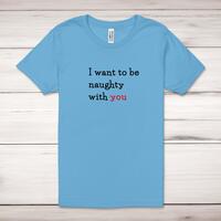 Naughty With You Adult T-ShirtA novelty unisex adult t-shirt with 'I Want To Be Naughty With You' printed across the front of a 100% cotton* t-shirt. This novelty t-shirt is great as a gift for any occasion.All of our unisex adult t-shirts are designed and hand-printed in the UK and are manufactured from 100% ringspun cotton for a premium quality feel and feature double-stitched waist hem and sleeves, seamless double-needle collar, taped neck and shoulders, and a tubular body that has been quarter turned to avoid a centre crease; available in sizes from Extra Small to 4XL*. *Black & White tees available in sizes XS - 4XL, all other colours available XS - 2XL Size GuideUnisex adult t-shirts are measured across the chest, in inchesXS 30/32'S 34/36'M 38/40'L 42/44'XL 46/48'2XL 50/52'3XL 54/56'4XL 58/60'See more on our clothing size guide (opens in new tab)Please NoteAll of our items are hand-printed to order, as a result, colours may vary between prints - images are for illustration purposes only.Show more products with the Naughty With You design