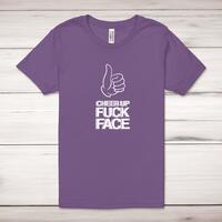 Cheer Up Fuck Face Adult T-ShirtA rude unisex adult t-shirt with 'Cheer Up Fuck Face' printed across the front of a 100% cotton* t-shirt. This rude t-shirt is great as a gift for any occasion.All of our unisex adult t-shirts are designed and hand-printed in the UK and are manufactured from 100% ringspun cotton for a premium quality feel and feature double-stitched waist hem and sleeves, seamless double-needle collar, taped neck and shoulders, and a tubular body that has been quarter turned to avoid a centre crease; available in sizes from Extra Small to 4XL*. *Black & White tees available in sizes XS - 4XL, all other colours available XS - 2XL Size GuideUnisex adult t-shirts are measured across the chest, in inchesXS 30/32'S 34/36'M 38/40'L 42/44'XL 46/48'2XL 50/52'3XL 54/56'4XL 58/60'See more on our clothing size guide (opens in new tab)Please NoteAll of our items are hand-printed to order, as a result, colours may vary between prints - images are for illustration purposes only.Show more products with the Cheer Up Fuck Face design