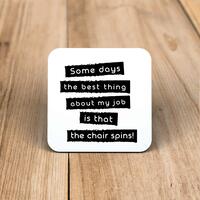 Some Days The Best Thing About My Job CoasterA novelty gift coaster with 'Sometimes the best thing about my job is that the chair spins!' printed on a high gloss coaster. Simple and straight to the point this novelty coaster is great as a gift for any occasion.Single hardwood coasterMeasures approx. 9x9cmFull-colour printPlease NoteAll of our items are hand-printed to order, as a result, colours may vary between prints - images are for illustration purposes only.