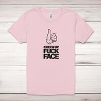 Cheer Up Fuck Face Adult T-ShirtA rude unisex adult t-shirt with 'Cheer Up Fuck Face' printed across the front of a 100% cotton* t-shirt. This rude t-shirt is great as a gift for any occasion.All of our unisex adult t-shirts are designed and hand-printed in the UK and are manufactured from 100% ringspun cotton for a premium quality feel and feature double-stitched waist hem and sleeves, seamless double-needle collar, taped neck and shoulders, and a tubular body that has been quarter turned to avoid a centre crease; available in sizes from Extra Small to 4XL*. *Black & White tees available in sizes XS - 4XL, all other colours available XS - 2XL Size GuideUnisex adult t-shirts are measured across the chest, in inchesXS 30/32'S 34/36'M 38/40'L 42/44'XL 46/48'2XL 50/52'3XL 54/56'4XL 58/60'See more on our clothing size guide (opens in new tab)Please NoteAll of our items are hand-printed to order, as a result, colours may vary between prints - images are for illustration purposes only.Show more products with the Cheer Up Fuck Face design