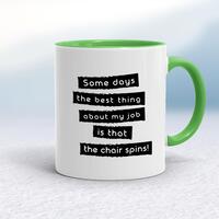 Some Days The Best Thing About My Job MugA novelty mug with 'Sometimes the best thing about my job is that the chair spins!' printed on both sides. Simple and straight to the point this novelty mug is great as a gift for any occasion.Our Some Days The Best Thing About My Job mug is hand-printed on both sides (front/back) of a high-quality mug and available in a variety of styles and colours. Choose from A classic ceramic mug in white glossVibrantly coloured inner and matching handle mugsGold or silver sparkling pearl finish mugsGold, silver, pink or blue glitter mugsPremium satin mugs in a choice of colours.Please NoteAll of our items are hand-printed to order, as a result, colours may vary between prints - images are for illustration purposes only.