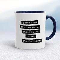 Some Days The Best Thing About My Job MugA novelty mug with 'Sometimes the best thing about my job is that the chair spins!' printed on both sides. Simple and straight to the point this novelty mug is great as a gift for any occasion.Our Some Days The Best Thing About My Job mug is hand-printed on both sides (front/back) of a high-quality mug and available in a variety of styles and colours. Choose from A classic ceramic mug in white glossVibrantly coloured inner and matching handle mugsGold or silver sparkling pearl finish mugsGold, silver, pink or blue glitter mugsPremium satin mugs in a choice of colours.Please NoteAll of our items are hand-printed to order, as a result, colours may vary between prints - images are for illustration purposes only.