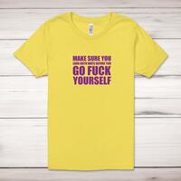 Before You Go Fuck Yourself Adult T-ShirtA rude unisex adult t-shirt with 'Make Sure You Look Both Ways Before You Go Fuck Yourself' printed across the front of a 100% cotton* t-shirt. This rude t-shirt is great as a gift for any occasion.All of our unisex adult t-shirts are designed and hand-printed in the UK and are manufactured from 100% ringspun cotton for a premium quality feel and feature double-stitched waist hem and sleeves, seamless double-needle collar, taped neck and shoulders, and a tubular body that has been quarter turned to avoid a centre crease; available in sizes from Extra Small to 4XL*. *Black & White tees available in sizes XS - 4XL, all other colours available XS - 2XL Size GuideUnisex adult t-shirts are measured across the chest, in inchesXS 30/32'S 34/36'M 38/40'L 42/44'XL 46/48'2XL 50/52'3XL 54/56'4XL 58/60'See more on our clothing size guide (opens in new tab)Please NoteAll of our items are hand-printed to order, as a result, colours may vary between prints - images are for illustration purposes only.Show more products with the Before You Go Fuck Yourself design