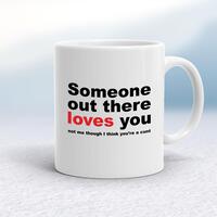 Someone Out There Loves You MugA rude mug with 'Someone out there loves you not me though I think you're a cunt' printed on both sides. Simple and straight to the point this rude mug is great as a gift for any occasion. If you would like a different swear word, add a note to your order with your preferred insult.Our Someone Out There Loves You mug is hand-printed on both sides (front/back) of a high-quality mug and available in a variety of styles and colours. Choose from A classic ceramic mug in white glossVibrantly coloured inner and matching handle mugsGold or silver sparkling pearl finish mugsGold, silver, pink or blue glitter mugsPremium satin mugs in a choice of colours.Please NoteAll of our items are hand-printed to order, as a result, colours may vary between prints - images are for illustration purposes only.