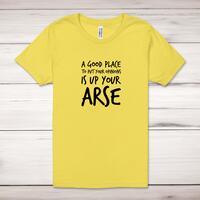 Opinions Up Your Arse Adult T-ShirtA rude unisex adult t-shirt with 'A Good Place To Put Your Opinions Is Up Your Arse' printed across the front of a 100% cotton* t-shirt. This rude t-shirt is great as a gift for any occasion.All of our unisex adult t-shirts are designed and hand-printed in the UK and are manufactured from 100% ringspun cotton for a premium quality feel and feature double-stitched waist hem and sleeves, seamless double-needle collar, taped neck and shoulders, and a tubular body that has been quarter turned to avoid a centre crease; available in sizes from Extra Small to 4XL*. *Black & White tees available in sizes XS - 4XL, all other colours available XS - 2XL Size GuideUnisex adult t-shirts are measured across the chest, in inchesXS 30/32'S 34/36'M 38/40'L 42/44'XL 46/48'2XL 50/52'3XL 54/56'4XL 58/60'See more on our clothing size guide (opens in new tab)Please NoteAll of our items are hand-printed to order, as a result, colours may vary between prints - images are for illustration purposes only.Show more products with the Opinions Up Your Arse design