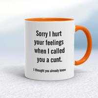 Sorry I Hurt Your Feelings MugA rude mug with 'Sorry I hurt your feelings when I called you a cunt. I thought you already knew' printed on both sides. Simple and straight to the point this rude mug is great as a gift for any occasion.Our Sorry I Hurt Your Feelings mug is hand-printed on both sides (front/back) of a high-quality mug and available in a variety of styles and colours. Choose from A classic ceramic mug in white glossVibrantly coloured inner and matching handle mugsGold or silver sparkling pearl finish mugsGold, silver, pink or blue glitter mugsPremium satin mugs in a choice of colours.Please NoteAll of our items are hand-printed to order, as a result, colours may vary between prints - images are for illustration purposes only.