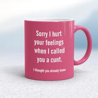 Sorry I Hurt Your Feelings MugA rude mug with 'Sorry I hurt your feelings when I called you a cunt. I thought you already knew' printed on both sides. Simple and straight to the point this rude mug is great as a gift for any occasion.Our Sorry I Hurt Your Feelings mug is hand-printed on both sides (front/back) of a high-quality mug and available in a variety of styles and colours. Choose from A classic ceramic mug in white glossVibrantly coloured inner and matching handle mugsGold or silver sparkling pearl finish mugsGold, silver, pink or blue glitter mugsPremium satin mugs in a choice of colours.Please NoteAll of our items are hand-printed to order, as a result, colours may vary between prints - images are for illustration purposes only.