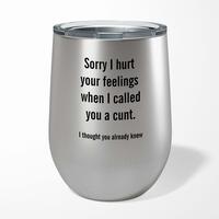 Sorry I Hurt Your Feelings Wine TumblerOur Sorry I Hurt Your Feelings 12oz tumbler is hand-printed with 'Sorry I Hurt Your Feelings' on both sides (front/back) of an insulated stainless steel wine tumbler and available in a variety of colours.Ideal for weekends away or relaxing in the garden, our 12oz Wine Tumbler promises to keep cold drinks cold and hot drinks hot for longer than standard drinkware. Made from premium grade, food-safe stainless steel with double-wall vacuum insulation. A fantastic rude tumbler, ideal for keeping your favourite tipple at the perfect temperature whatever the weather. High-grade stainless steel double-wall construction. Insulated for hot or cold liquids. Flat bottom design means less risk of accidental spillages. See through lid allows you to carry your beverage around without spilling. Drinking spout incorporated in to the lid. Please Note All of our items are hand-printed to order, as a result, colours may vary between prints - images are for illustration purposes only.
