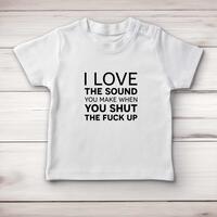 Sound You Make Baby T-ShirtOur rude baby t-shirt is printed with 'I Love The Sound You Make When You Shut The Fuck Up' and is super snug and ultra comfy.Super soft and stretchy 100% cotton, short sleeve t-shirt with 2 self-coloured poppers at side neck for ease of dressing. Cover stitch at hem and sleeve ends. A perfect gift;ideal for any occasion.Not only will your baby t-shirt be super snug and ultra comfy but you will feel comforted knowing that the processes of manufacturing cotton-based garments have a positive impact on the communities and on the environment in which the Babybugz brand work.Machine washableFabric: 100% Cotton, 200gsm, Interlock weaveSoft and stretchy fabric2 self-coloured poppers at side neckCover stitch at hem and sleeve ends1x1 rib neckSize GuideMeasurements in cm relate to baby's height0/3 mths: 53-60cm 3/6 mths: 60-66cm 6/12 mths: 66-76cm 12/18 mths: 76-86cm 18/24 mths: 86-93cmSee more on our clothing size guide (opens in new tab)\nPlease NoteAll of our items are hand-printed to order, as a result, colours may vary between prints - images are for illustration purposes only.