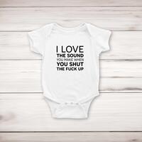 Sound You Make BabygrowSuper soft and stretchy 100% cotton, short sleeve, babygrow / romper suit / sleepsuit with poppers for ease of dressing. Printed with 'I Love The Sound You Make When You Shut The Fuck Up' across the front of the garment.Machine washableFabric: 100% CottonSize GuideMeasurements in cm relate to baby's height0/3mths: - 53-60cm 3/6mths: - 60-66cm 6/12mths: - 66-76cm See more on our clothing size guide (opens in new tab)Please NoteAll of our items are hand-printed to order, as a result, colours may vary between prints - images are for illustration purposes only.