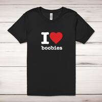 I Love Boobies Adult T-ShirtA novelty unisex adult t-shirt with 'I Love Boobies' printed across the front of a 100% cotton* t-shirt. This novelty t-shirt is great as a gift for any occasion.All of our unisex adult t-shirts are designed and hand-printed in the UK and are manufactured from 100% ringspun cotton for a premium quality feel and feature double-stitched waist hem and sleeves, seamless double-needle collar, taped neck and shoulders, and a tubular body that has been quarter turned to avoid a centre crease; available in sizes from Extra Small to 4XL*. *Black & White tees available in sizes XS - 4XL, all other colours available XS - 2XL Size GuideUnisex adult t-shirts are measured across the chest, in inchesXS 30/32'S 34/36'M 38/40'L 42/44'XL 46/48'2XL 50/52'3XL 54/56'4XL 58/60'See more on our clothing size guide (opens in new tab)Please NoteAll of our items are hand-printed to order, as a result, colours may vary between prints - images are for illustration purposes only.Show more products with the I Love Boobies design