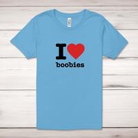 I Love Boobies Adult T-ShirtA novelty unisex adult t-shirt with 'I Love Boobies' printed across the front of a 100% cotton* t-shirt. This novelty t-shirt is great as a gift for any occasion.All of our unisex adult t-shirts are designed and hand-printed in the UK and are manufactured from 100% ringspun cotton for a premium quality feel and feature double-stitched waist hem and sleeves, seamless double-needle collar, taped neck and shoulders, and a tubular body that has been quarter turned to avoid a centre crease; available in sizes from Extra Small to 4XL*. *Black & White tees available in sizes XS - 4XL, all other colours available XS - 2XL Size GuideUnisex adult t-shirts are measured across the chest, in inchesXS 30/32'S 34/36'M 38/40'L 42/44'XL 46/48'2XL 50/52'3XL 54/56'4XL 58/60'See more on our clothing size guide (opens in new tab)Please NoteAll of our items are hand-printed to order, as a result, colours may vary between prints - images are for illustration purposes only.Show more products with the I Love Boobies design