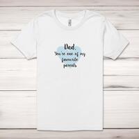 Dad, You're One Of My Favourite Parents Adult T-ShirtA novelty unisex adult t-shirt with 'Dad, You're One Of My Favourite Parents' printed across the front of a 100% cotton* t-shirt. This novelty t-shirt is great as a gift for any occasion.All of our unisex adult t-shirts are designed and hand-printed in the UK and are manufactured from 100% ringspun cotton for a premium quality feel and feature double-stitched waist hem and sleeves, seamless double-needle collar, taped neck and shoulders, and a tubular body that has been quarter turned to avoid a centre crease; available in sizes from Extra Small to 4XL*. *Black & White tees available in sizes XS - 4XL, all other colours available XS - 2XL Size GuideUnisex adult t-shirts are measured across the chest, in inchesXS 30/32'S 34/36'M 38/40'L 42/44'XL 46/48'2XL 50/52'3XL 54/56'4XL 58/60'See more on our clothing size guide (opens in new tab)Please NoteAll of our items are hand-printed to order, as a result, colours may vary between prints - images are for illustration purposes only.Show more products with the My Favourite Parents design