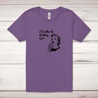 I'd Rather Be Drinking Gin Adult T-ShirtA novelty unisex adult t-shirt with 'I'd Rather Be Drinking Gin' printed across the front of a 100% cotton* t-shirt. This novelty t-shirt is great as a gift for any occasion.All of our unisex adult t-shirts are designed and hand-printed in the UK and are manufactured from 100% ringspun cotton for a premium quality feel and feature double-stitched waist hem and sleeves, seamless double-needle collar, taped neck and shoulders, and a tubular body that has been quarter turned to avoid a centre crease; available in sizes from Extra Small to 4XL*. *Black & White tees available in sizes XS - 4XL, all other colours available XS - 2XL Size GuideUnisex adult t-shirts are measured across the chest, in inchesXS 30/32'S 34/36'M 38/40'L 42/44'XL 46/48'2XL 50/52'3XL 54/56'4XL 58/60'See more on our clothing size guide (opens in new tab)Please NoteAll of our items are hand-printed to order, as a result, colours may vary between prints - images are for illustration purposes only.Show more products with the I'd Rather Be Drinking Gin design