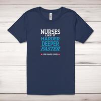 Nurses Like It Harder Adult T-ShirtA novelty unisex adult t-shirt with 'Nurses Like It Harder, Deeper, Faster - CPR Saves Lives' printed across the front of a 100% cotton* t-shirt. This novelty t-shirt is great as a gift for any occasion.All of our unisex adult t-shirts are designed and hand-printed in the UK and are manufactured from 100% ringspun cotton for a premium quality feel and feature double-stitched waist hem and sleeves, seamless double-needle collar, taped neck and shoulders, and a tubular body that has been quarter turned to avoid a centre crease; available in sizes from Extra Small to 4XL*. *Black & White tees available in sizes XS - 4XL, all other colours available XS - 2XL Size GuideUnisex adult t-shirts are measured across the chest, in inchesXS 30/32'S 34/36'M 38/40'L 42/44'XL 46/48'2XL 50/52'3XL 54/56'4XL 58/60'See more on our clothing size guide (opens in new tab)Please NoteAll of our items are hand-printed to order, as a result, colours may vary between prints - images are for illustration purposes only.Show more products with the Nurses Like It Harder design