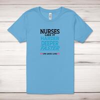 Nurses Like It Harder Adult T-ShirtA novelty unisex adult t-shirt with 'Nurses Like It Harder, Deeper, Faster - CPR Saves Lives' printed across the front of a 100% cotton* t-shirt. This novelty t-shirt is great as a gift for any occasion.All of our unisex adult t-shirts are designed and hand-printed in the UK and are manufactured from 100% ringspun cotton for a premium quality feel and feature double-stitched waist hem and sleeves, seamless double-needle collar, taped neck and shoulders, and a tubular body that has been quarter turned to avoid a centre crease; available in sizes from Extra Small to 4XL*. *Black & White tees available in sizes XS - 4XL, all other colours available XS - 2XL Size GuideUnisex adult t-shirts are measured across the chest, in inchesXS 30/32'S 34/36'M 38/40'L 42/44'XL 46/48'2XL 50/52'3XL 54/56'4XL 58/60'See more on our clothing size guide (opens in new tab)Please NoteAll of our items are hand-printed to order, as a result, colours may vary between prints - images are for illustration purposes only.Show more products with the Nurses Like It Harder design