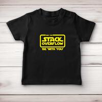 Stack Overflow Baby T-ShirtOur geeky baby t-shirt is printed with 'May The Stack Overflow Be with you' in a Star Wars style logo and is super snug and ultra comfy.Super soft and stretchy 100% cotton, short sleeve t-shirt with 2 self-coloured poppers at side neck for ease of dressing. Cover stitch at hem and sleeve ends. A perfect gift;ideal for any occasion.Not only will your baby t-shirt be super snug and ultra comfy but you will feel comforted knowing that the processes of manufacturing cotton-based garments have a positive impact on the communities and on the environment in which the Babybugz brand work.Machine washableFabric: 100% Cotton, 200gsm, Interlock weaveSoft and stretchy fabric2 self-coloured poppers at side neckCover stitch at hem and sleeve ends1x1 rib neckSize GuideMeasurements in cm relate to baby's height0/3 mths: 53-60cm 3/6 mths: 60-66cm 6/12 mths: 66-76cm 12/18 mths: 76-86cm 18/24 mths: 86-93cmSee more on our clothing size guide (opens in new tab)\nPlease NoteAll of our items are hand-printed to order, as a result, colours may vary between prints - images are for illustration purposes only.