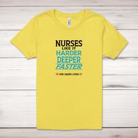 Nurses Like It Harder Adult T-ShirtA novelty unisex adult t-shirt with 'Nurses Like It Harder, Deeper, Faster - CPR Saves Lives' printed across the front of a 100% cotton* t-shirt. This novelty t-shirt is great as a gift for any occasion.All of our unisex adult t-shirts are designed and hand-printed in the UK and are manufactured from 100% ringspun cotton for a premium quality feel and feature double-stitched waist hem and sleeves, seamless double-needle collar, taped neck and shoulders, and a tubular body that has been quarter turned to avoid a centre crease; available in sizes from Extra Small to 4XL*. *Black & White tees available in sizes XS - 4XL, all other colours available XS - 2XL Size GuideUnisex adult t-shirts are measured across the chest, in inchesXS 30/32'S 34/36'M 38/40'L 42/44'XL 46/48'2XL 50/52'3XL 54/56'4XL 58/60'See more on our clothing size guide (opens in new tab)Please NoteAll of our items are hand-printed to order, as a result, colours may vary between prints - images are for illustration purposes only.Show more products with the Nurses Like It Harder design