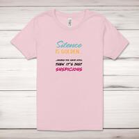 Silence Is Golden Adult T-ShirtA novelty unisex adult t-shirt with 'Silence is golden... ....unless you have kids, then it's just suspicious' printed across the front of a 100% cotton* t-shirt. This novelty t-shirt is great as a gift for any occasion.All of our unisex adult t-shirts are designed and hand-printed in the UK and are manufactured from 100% ringspun cotton for a premium quality feel and feature double-stitched waist hem and sleeves, seamless double-needle collar, taped neck and shoulders, and a tubular body that has been quarter turned to avoid a centre crease; available in sizes from Extra Small to 4XL*. *Black & White tees available in sizes XS - 4XL, all other colours available XS - 2XL Size GuideUnisex adult t-shirts are measured across the chest, in inchesXS 30/32'S 34/36'M 38/40'L 42/44'XL 46/48'2XL 50/52'3XL 54/56'4XL 58/60'See more on our clothing size guide (opens in new tab)Please NoteAll of our items are hand-printed to order, as a result, colours may vary between prints - images are for illustration purposes only.Show more products with the Silence Is Golden design