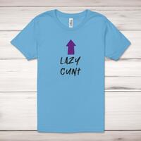 Lazy Cunt Adult T-ShirtA rude unisex adult t-shirt with 'Lazy Cunt' printed across the front of a 100% cotton* t-shirt. This rude t-shirt is great as a gift for any occasion.All of our unisex adult t-shirts are designed and hand-printed in the UK and are manufactured from 100% ringspun cotton for a premium quality feel and feature double-stitched waist hem and sleeves, seamless double-needle collar, taped neck and shoulders, and a tubular body that has been quarter turned to avoid a centre crease; available in sizes from Extra Small to 4XL*. *Black & White tees available in sizes XS - 4XL, all other colours available XS - 2XL Size GuideUnisex adult t-shirts are measured across the chest, in inchesXS 30/32'S 34/36'M 38/40'L 42/44'XL 46/48'2XL 50/52'3XL 54/56'4XL 58/60'See more on our clothing size guide (opens in new tab)Please NoteAll of our items are hand-printed to order, as a result, colours may vary between prints - images are for illustration purposes only.Show more products with the Lazy Cunt design
