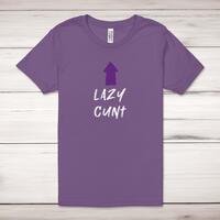 Lazy Cunt Adult T-ShirtA rude unisex adult t-shirt with 'Lazy Cunt' printed across the front of a 100% cotton* t-shirt. This rude t-shirt is great as a gift for any occasion.All of our unisex adult t-shirts are designed and hand-printed in the UK and are manufactured from 100% ringspun cotton for a premium quality feel and feature double-stitched waist hem and sleeves, seamless double-needle collar, taped neck and shoulders, and a tubular body that has been quarter turned to avoid a centre crease; available in sizes from Extra Small to 4XL*. *Black & White tees available in sizes XS - 4XL, all other colours available XS - 2XL Size GuideUnisex adult t-shirts are measured across the chest, in inchesXS 30/32'S 34/36'M 38/40'L 42/44'XL 46/48'2XL 50/52'3XL 54/56'4XL 58/60'See more on our clothing size guide (opens in new tab)Please NoteAll of our items are hand-printed to order, as a result, colours may vary between prints - images are for illustration purposes only.Show more products with the Lazy Cunt design
