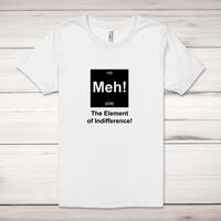 Meh! The Element Of Indifference Adult T-ShirtA geeky unisex adult t-shirt with 'Meh! The Element Of Indifference' printed across the front of a 100% cotton* t-shirt. This geeky t-shirt is great as a gift for any occasion.All of our adult t-shirts are designed and hand-printed in the UK and are manufactured from quality 100% combed and ringspun cotton for superior softness and comfort. This updated unisex essential fits like a well-loved favorite; featuring a crew neck, short sleeves, retail fit, unisex sizing, sideseams and shoulder taping. Available in sizes from Extra Small to 4XL*.*Black & White tees available in sizes XS - 4XL, all other colours available XS - 2XLSize GuideUnisex adult t-shirts are measured around the chest, in inchesXS 32/34'S 34/36'M 38/40'L 42/44'XL 46/48'2XL 50/52'3XL 54/56'4XL 58/60'See more on our clothing size guide (opens in new tab)Please NoteAll of our items are hand-printed to order, as a result, colours may vary between prints - images are for illustration purposes only.Show more products with the Meh! The Element Of Indifference design