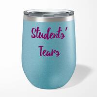 Students' Tears Wine TumblerOur Students' Tears 12oz tumbler is hand-printed with 'Students' Tears' on both sides (front/back) of an insulated stainless steel wine tumbler and available in a variety of colours.Ideal for weekends away or relaxing in the garden, our 12oz Wine Tumbler promises to keep cold drinks cold and hot drinks hot for longer than standard drinkware. Made from premium grade, food-safe stainless steel with double-wall vacuum insulation. A fantastic novelty tumbler, ideal for keeping your favourite tipple at the perfect temperature whatever the weather. High-grade stainless steel double-wall construction. Insulated for hot or cold liquids. Flat bottom design means less risk of accidental spillages. See through lid allows you to carry your beverage around without spilling. Drinking spout incorporated in to the lid. Please Note All of our items are hand-printed to order, as a result, colours may vary between prints - images are for illustration purposes only.