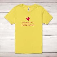 You Make My Fanny Flutter Adult T-ShirtA rude unisex adult t-shirt with 'You Make My Fanny Flutter' printed across the front of a 100% cotton* t-shirt. This rude t-shirt is great as a gift for any occasion.All of our adult t-shirts are designed and hand-printed in the UK and are manufactured from quality 100% combed and ringspun cotton for superior softness and comfort. This updated unisex essential fits like a well-loved favorite; featuring a crew neck, short sleeves, retail fit, unisex sizing, sideseams and shoulder taping. Available in sizes from Extra Small to 4XL*.*Black & White tees available in sizes XS - 4XL, all other colours available XS - 2XLSize GuideUnisex adult t-shirts are measured around the chest, in inchesXS 32/34'S 34/36'M 38/40'L 42/44'XL 46/48'2XL 50/52'3XL 54/56'4XL 58/60'See more on our clothing size guide (opens in new tab)Please NoteAll of our items are hand-printed to order, as a result, colours may vary between prints - images are for illustration purposes only.Show more products with the You Make My Fanny Flutter design