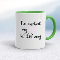 I've Washed My Dick In This Mug\nA rude mug with "I've Washed My Dick In This Mug" printed on both sides. Simple and straight to the point this rude mug is great as a gift for any occasion.\nOur I've Washed My Dick In This mug is hand-printed on both sides (front/back) of a high-quality mug and available in a variety of styles and colours. Choose from A classic ceramic mug in white glossVibrantly coloured inner and matching handle mugsGold or silver sparkling pearl finish mugsGold, silver, pink or blue glitter mugs\n\n\nPlease Note\nAll of our items are hand-printed to order, as a result, colours may vary between prints - images are for illustration purposes only.\n