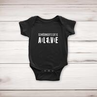 Schrodinger's Cat BabygrowSuper soft and stretchy 100% cotton, short sleeve, babygrow / romper suit / sleepsuit with poppers for ease of dressing. Printed with 'Schrodinger's Cat Is Dead or Alive' across the front of the garment.Machine washableFabric: 100% CottonSize GuideMeasurements in cm relate to baby's height0/3mths: - 53-60cm 3/6mths: - 60-66cm 6/12mths: - 66-76cm See more on our clothing size guide (opens in new tab)Please NoteAll of our items are hand-printed to order, as a result, colours may vary between prints - images are for illustration purposes only.