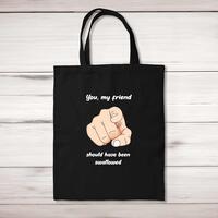 Should Have Been Swallowed Tote BagA rude shopping bag with 'Should Have Been Swallowed' printed on the front of a 100% cotton tote bag. This rude bag is a perfect replacement for plastic bags in retail, supermarkets and any other kinds of stores. Reusable, sustainable and multifunctional. 100% 150gsm Cotton10 litre capacity38 x 42 cmLong handled shopper, for easy use over the shoulderAvailable in a range of coloursDesigned and hand-printed in the UKPlease NoteAll of our items are hand-printed to order, as a result, colours may vary between prints - images are for illustration purposes only.