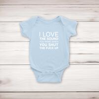 Sound You Make BabygrowSuper soft and stretchy 100% cotton, short sleeve, babygrow / romper suit / sleepsuit with poppers for ease of dressing. Printed with 'I Love The Sound You Make When You Shut The Fuck Up' across the front of the garment.Machine washableFabric: 100% CottonSize GuideMeasurements in cm relate to baby's height0/3mths: - 53-60cm 3/6mths: - 60-66cm 6/12mths: - 66-76cm See more on our clothing size guide (opens in new tab)Please NoteAll of our items are hand-printed to order, as a result, colours may vary between prints - images are for illustration purposes only.