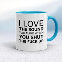 Sound You Make MugA rude mug with 'I Love The Sound You Make When You Shut The Fuck Up' printed on both sides. Simple and straight to the point this rude mug is great as a gift for any occasion.Our Sound You Make mug is hand-printed on both sides (front/back) of a high-quality mug and is available in a variety of styles and colours. Choose from A classic ceramic mug in white glossVibrantly coloured inner and matching handle mugsGold or silver sparkling pearl finish mugsGold, silver, pink or blue glitter mugsPremium satin mugs in a choice of colours.Please NoteAll of our items are hand-printed to order, as a result, colours may vary between prints - images are for illustration purposes only.