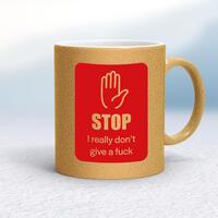 Stop MugA rude mug with 'Stop I Really Don't Give A Fuck' printed on both sides. Simple and straight to the point this rude mug is great as a gift for any occasion.Our Stop mug is hand-printed on both sides (front/back) of a high-quality mug and is available in a variety of styles and colours. Choose from A classic ceramic mug in white glossVibrantly coloured inner and matching handle mugsGold or silver sparkling pearl finish mugsGold, silver, pink or blue glitter mugsPremium satin mugs in a choice of colours.Please NoteAll of our items are hand-printed to order, as a result, colours may vary between prints - images are for illustration purposes only.