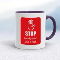 Stop MugA rude mug with 'Stop I Really Don't Give A Fuck' printed on both sides. Simple and straight to the point this rude mug is great as a gift for any occasion.Our Stop mug is hand-printed on both sides (front/back) of a high-quality mug and is available in a variety of styles and colours. Choose from A classic ceramic mug in white glossVibrantly coloured inner and matching handle mugsGold or silver sparkling pearl finish mugsGold, silver, pink or blue glitter mugsPremium satin mugs in a choice of colours.Please NoteAll of our items are hand-printed to order, as a result, colours may vary between prints - images are for illustration purposes only.