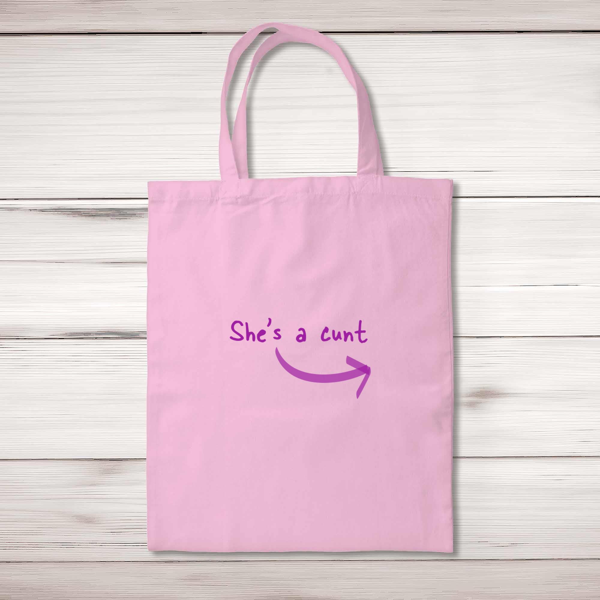Super Twat Tote BagA rude shopping bag with 'Super Twat' printed on the front of a 100% cotton tote bag. This rude bag is a perfect replacement for plastic bags in retail, supermarkets and any other kinds of stores. Reusable, sustainable and multifunctional. 100% 150gsm Cotton10 litre capacity38 x 42 cmLong handled shopper, for easy use over the shoulderAvailable in a range of coloursDesigned and hand-printed in the UKPlease NoteAll of our items are hand-printed to order, as a result, colours may vary between prints - images are for illustration purposes only.